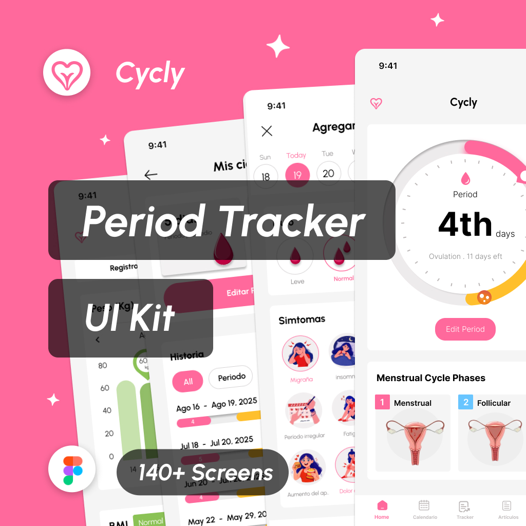 Cycly è un UI Kit premium per app mobile di monitoraggio del ciclo mestruale, progettato per offrire un controllo semplice, preciso e intuitivo del ciclo e dell’ovulazione. Consente di monitorare il ciclo, i sintomi e i progressi di salute, oltre ad accedere ad articoli educativi e insight personalizzati.