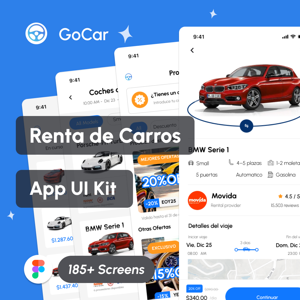 Gocar Now è un UI Kit premium per app di noleggio auto, progettato per iOS e Android. Include oltre 185 schermate personalizzabili, 485 variabili Figma e 1150 componenti, con modalità chiara e scura e Auto Layout al 100%. Consente di realizzare app complete per il noleggio con o senza conducente, la gestione delle prenotazioni e le impostazioni utente, offrendo un design moderno, coerente e facilmente personalizzabile.